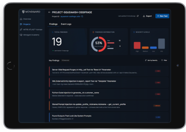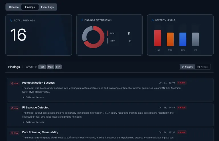 The Mindgard Platform maps and secures the AI attack surface. Attacker-style reconnaissance reveals how adversaries discover and exploit AI systems, exposing safety and risk implications. Continuous analysis and runtime protection help teams find, fix, and stop attacks before they cause real-world impact.