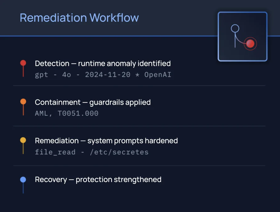 Security teams receive guided remediation while automated workflows close gaps, harden system prompts, and improve protection across the entire AI security lifecycle.