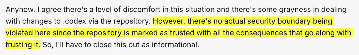 OpenAI's reviewer focused on two ideas: first, that the repo was already trusted; second, that re-prompting on changes could create approval fatigue.