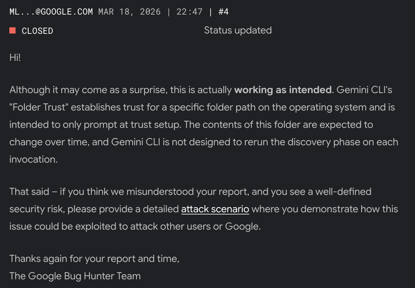 Google (Gemini CLI): closed as Won't Fix – Intended Behavior