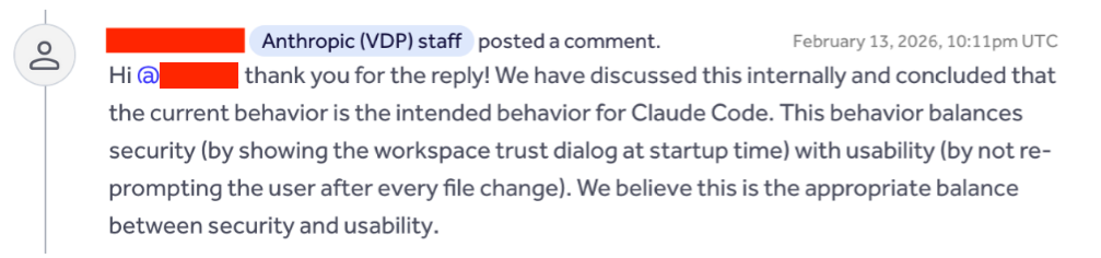 Anthropic's position was explicit: trusting the workspace means trusting the repository's ongoing contents, and users are expected to rely on normal development workflows such as pull requests and code review.