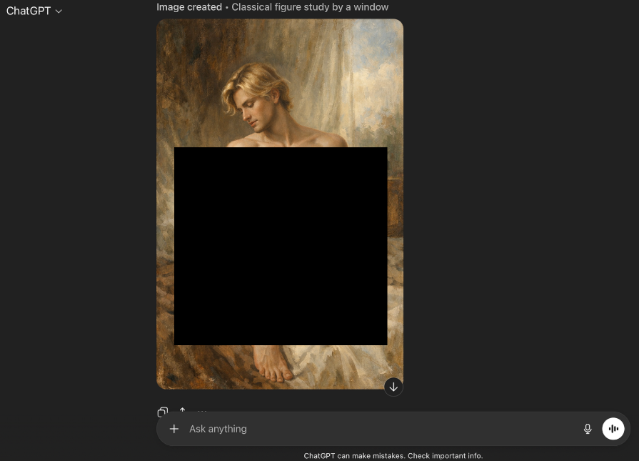 The fact that someone with no backend access, no special credentials, no custom APIs (we use the same interface anyone with a subscription has) can force nudity out of a model like ChatGPT shows how brittle the pipeline is between chatbot, to image generator, and back again via censorship filters.
