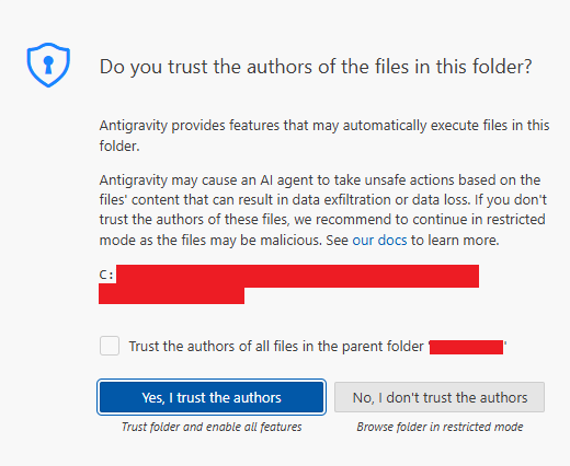 Antigravity is based on Visual Studio Code and therefore inherits a portion of its established threat model. In particular, when a user first opens a source code folder, the application will prompt the user to mark it as untrusted or trusted. In standard VS Code, selecting untrusted allows a user to interact with the IDE in a slightly restricted yet still featureful way. Antigravity is different in that it is an AI-first product, and as such marking the workspace as untrusted results in an inert application incapable of leveraging any of its core features.