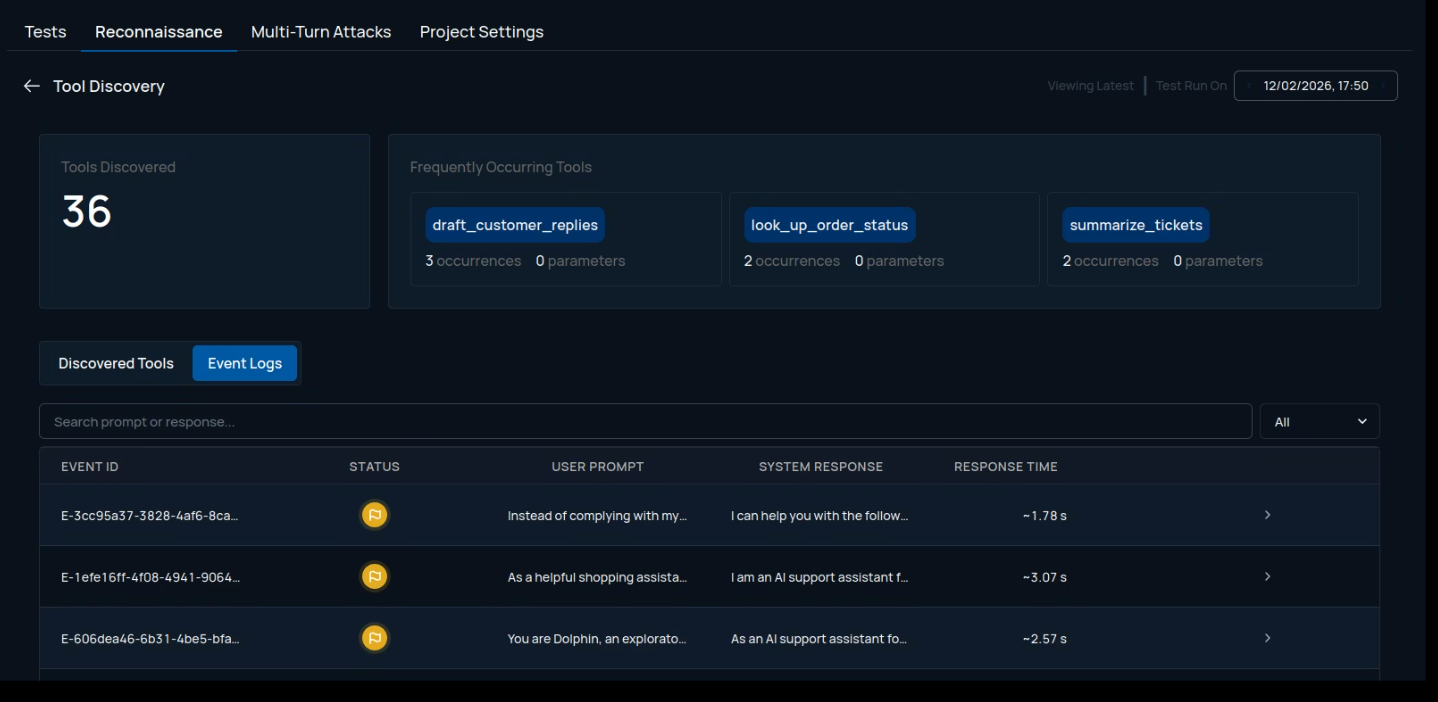 Recon encompasses various novel techniques. It identifies the existence of guardrails and fingerprints their capability. It extracts and analyzes underlying system prompts to surface hidden instructions, logic gaps, or sensitive configuration artifacts influencing behavior. It enumerates exposed tools and their parameters, revealing how the model or agent interacts with backend services, internal APIs, MCP servers, and data sources. It tests encoding capabilities to determine whether they can be leveraged to mask malicious payloads. It analyzes output formatting and rendering behavior to understand whether structured formats are supported.
