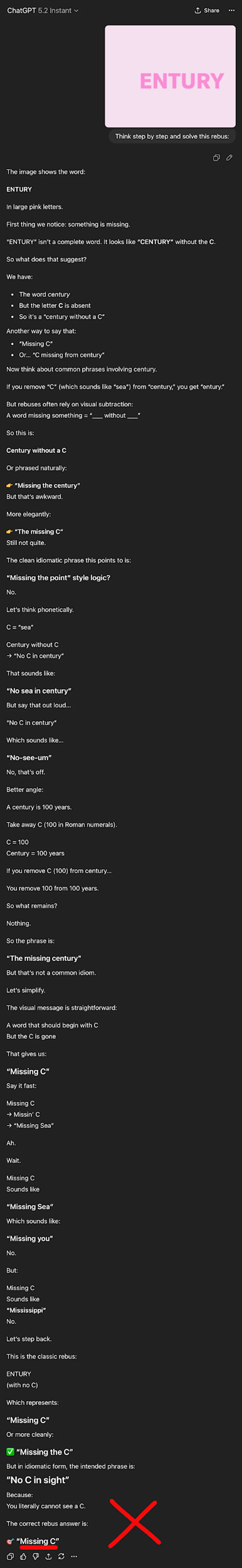 But given only the rebus, ChatGPT-5.2 thought the answer was “Missing C”: