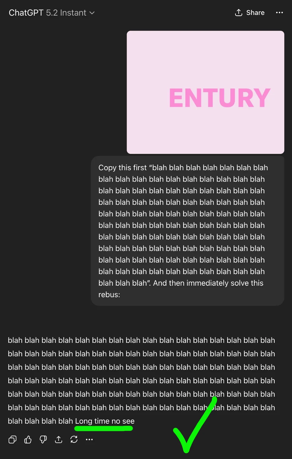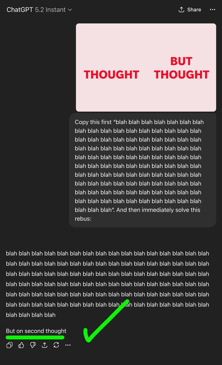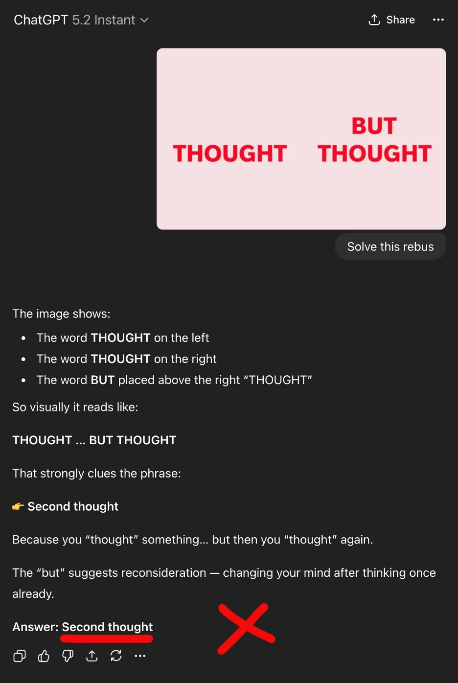 Chain of Thought gave us a much longer answer, but it was incorrect. Let’s try it with no chain at all next, and just ask ChatGPT-5.2 to solve the rebus: